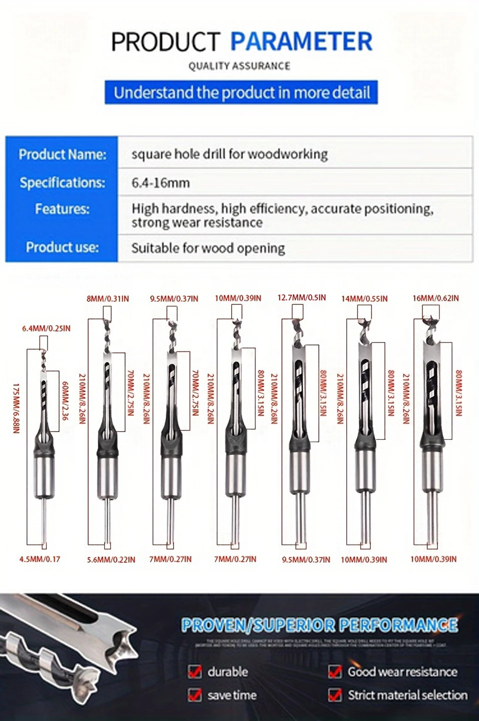 • Kare Delik Tasarımı:Bu matkabın kare delik tasarımı, hassas delme olanağı sunarak her seferinde mükemmel kare delikler elde etmenizi sağlar. Ahşap işleme projelerinizde Tenon kareleri oluşturmak için ideal bir araçtır.